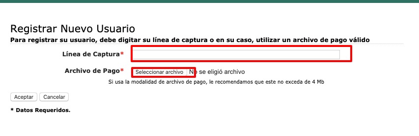 4: Para registrar un nuevo usuario usted debe indicar su línea de captura o bien utilizar un archivo de pago válido. Seguidamente haga clic en ACEPTAR.